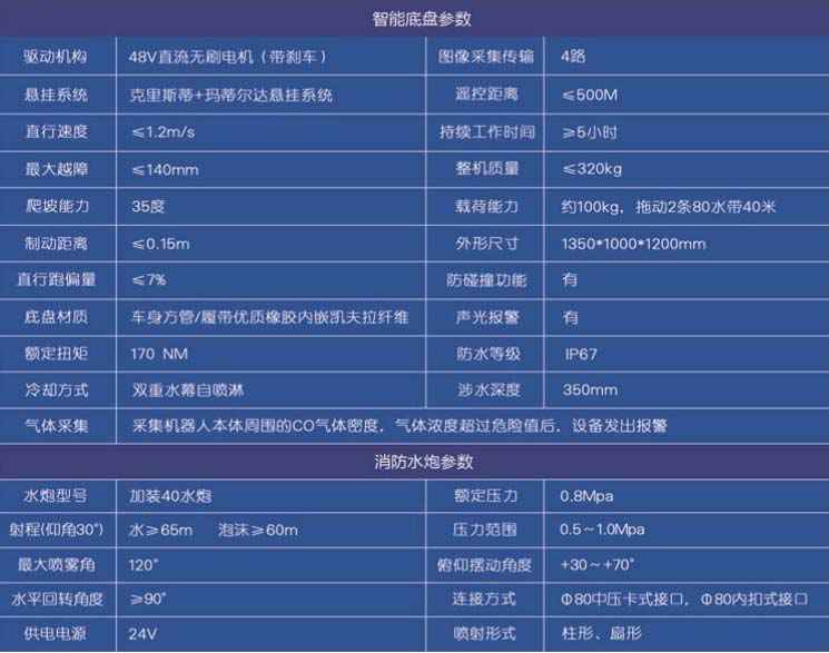 消防机器人采用履带式底盘、搭载消防水炮、温湿度探测器、摄像机、照明、等装备,代替消防救援人员进入易燃、易爆、有毒、缺氧、浓烟、高温等危险灾害事故现场进行灭火,有效的解决消防人员在上述场所面临的人身安全、数据信息采集不足等问题,可以防止火灾产生爆炸对人员造成的伤害,对提高救援安全性、减少人员伤亡具有重要意义。